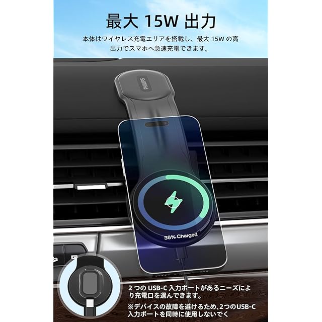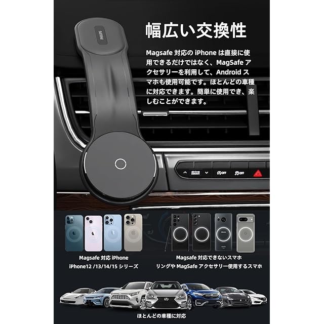 商品名:Philips (フィリップス) 車載スマホホルダー マグネット magsafeホルダー 15W急速充電 携帯ホルダー 自由調整 超強力吸着 片手操作 車用ホルダー 3M粘着テープ 繰り返し利用可能 カー用品 全機種対応 DLK2301Q