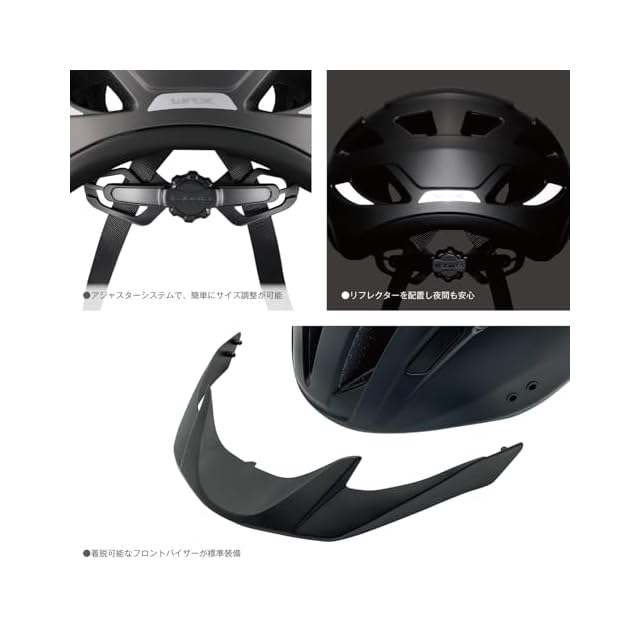 大きめなダイアルで調整しやすいダイヤル式アジャスター。車などのライトに反射し夜間の視認性を高める反射ステッカーを採用。