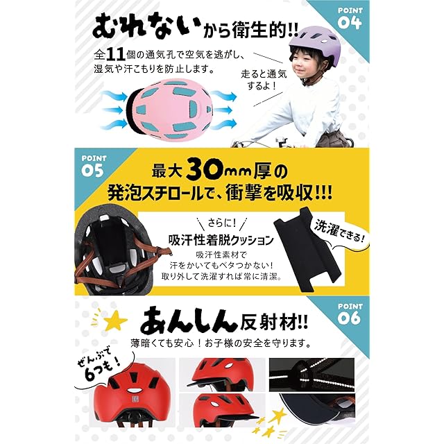 【よりフィットする日本人規格を採用!子どもを守る7つのポイント】 ①:超 軽量 250g。首への負担軽減を考えました。 ②:アジャスター付きなので成長期の 小学生 幼稚園 児 のお子様でも安心です。 ③:取り外し可能なバイザー付きで日差しが強い日は日差しからも守ります。 ④:11個の通気口で湿気や熱がこもるのを防ぎます。 ⑤:最大30mm厚のクッションで衝撃を吸収します。 ⑥:6つの反射材で薄暗い道での安全も守ります。 ⑦:こだわりのスポーツタイプ ヘルメット 。前につばが出ている形状なので転んだ際にお顔を守ってくれます。