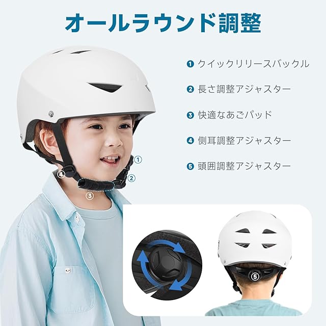 【3つのサイズ+フル調整】当社の自転車 ヘルメットは、大人、ティーン、子供用の3つのサイズをご用意しています。S:51 – 54cm(20 - 21.3 インチ)/ M:54 – 58cm(21.3 – 22.8 インチ)/ L:58 – 61cm(22.8 – 24インチ)。家族のお出かけやサイクリングに便利な選択肢を提供。調節可能なダイヤル バックルをひねってヘルメットの頭囲を変更できます。高度な 3-in-1 全方向調整システムにより、頭囲、あごストラップの長さ、あらゆる方向の微調整されたサイド ラグが可能になり、フィット感と快適な着用感を最大化します。あごストラップの長さは、肌に優しい調節可能なあごストラップで変更できます。側面の耳も、顔にフィットするように微調整できます。こどもと大人の顔がぴったりフィットします。