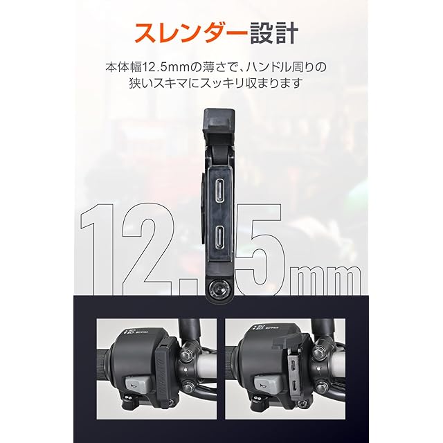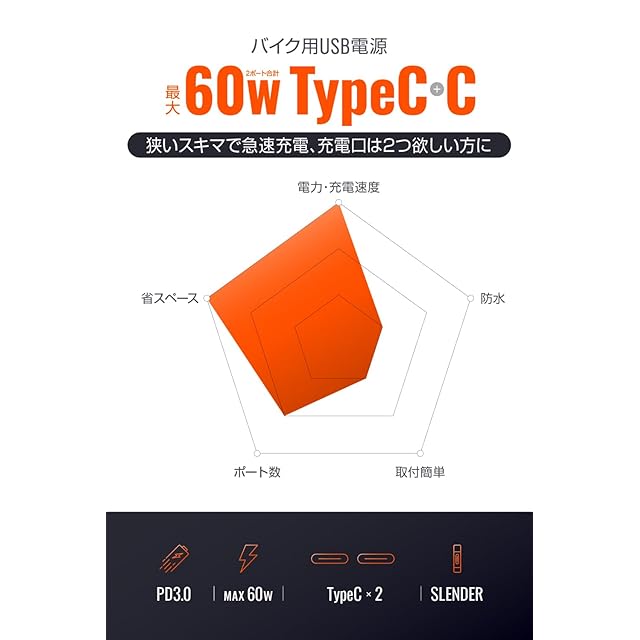 商品名:デイトナ(Daytona) バイク USB電源 防水 USB-C+USB-C PD3.0対応 急速充電 60W iPhone/Android対応 取付幅13mm リレー付き スレンダーUSB 2ポート 61403