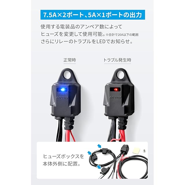 ヒューズ切れを確認できるLEDインジケーター付き。内蔵ヒューズの交換で必要なアンペア数に変更可能。(合計で20A以下の範囲)