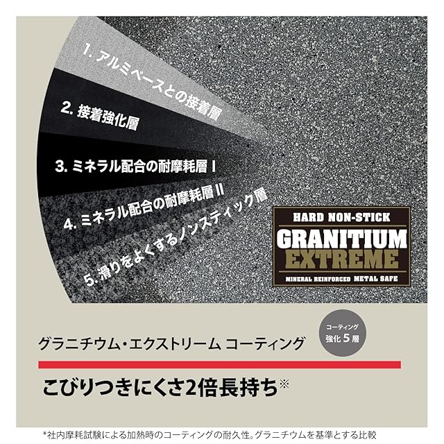 強化5層「グラニチウム・EXコーティング」:独自技術で鉱物を配合し、金属ヘラも使用可能な高耐久コーティング。御影石のような美しい仕上がりで、焦げ付きにくく、快適な調理を長期間キープします。