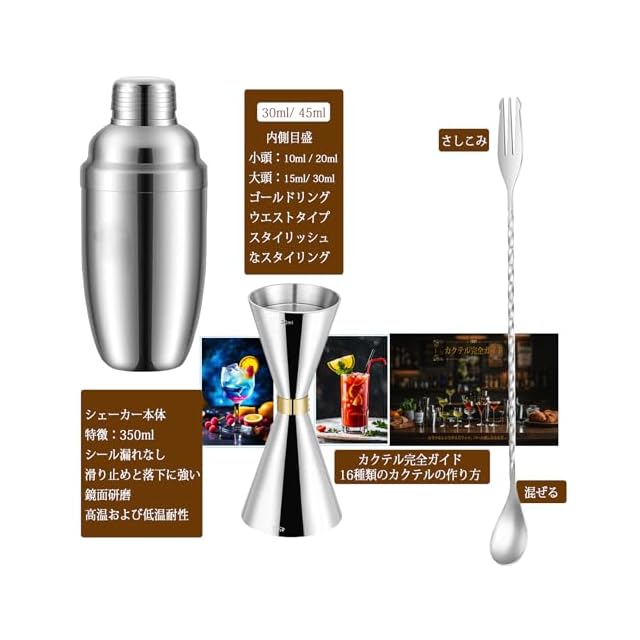 セット内容:カクテルシェーカー本体(350ml)、目盛り付き計量カップ(30ml/45ml)、バースプーン(30cm)材質:304ステンレス。 (3点バーセット)
