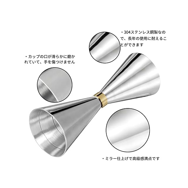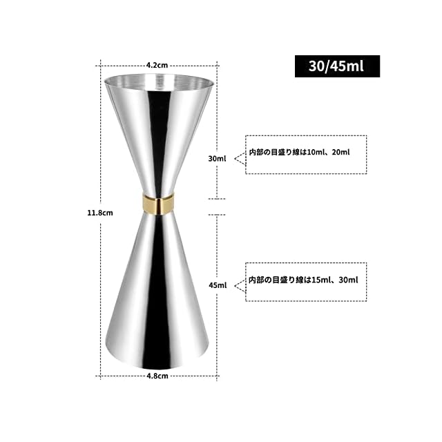 【ジガーカップ仕様】ダブル計量カップ一体型デザイン、小さなヘッドカップは30mlで、内部の目盛り線は10ml、20mlです;大きなカップは45mlで満たされ、内部スケールは15ml、30mlです。そのため、暗い場所でも正確な測定がされます。ステンレス製素材を使用し、頑丈で耐久性があります。