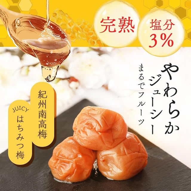 大粒で果肉たっぷりの完熟紀州南高梅を、減塩3%のはちみつ味で作りました。