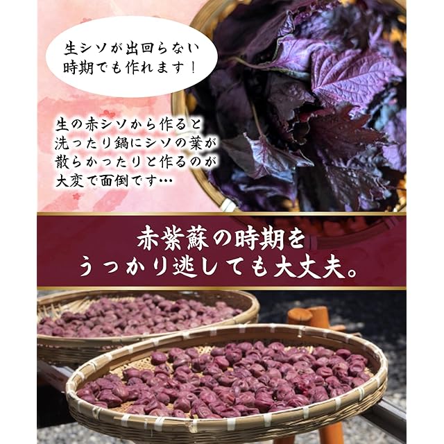 和歌山県の梅干し屋が作った、100%国産、無添加、無着色の赤しそです。 塩分約20%、合成着色料、保存料は使用していません! 赤しそを洗ったり、葉をちぎったり、あく抜きをする手間がかかりません。 紫蘇の準備する手間が省けて、初めての梅干し作りに手軽で便利! 赤紫蘇の時期をうっかり逃しても大丈夫。 手作り梅干しの味は格別です。