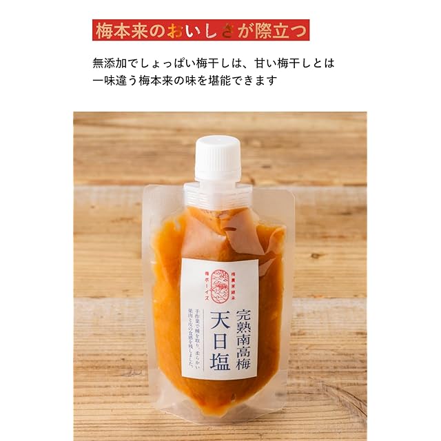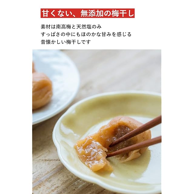 直前まで木から栄養をもらい自然落下した完熟梅と、天然塩だけを使用しており、添加物等は一切使用していません。 粒が大きく皮が柔らかい、完熟した紀州南高梅ならではの、フルーティーな味が楽しめます。