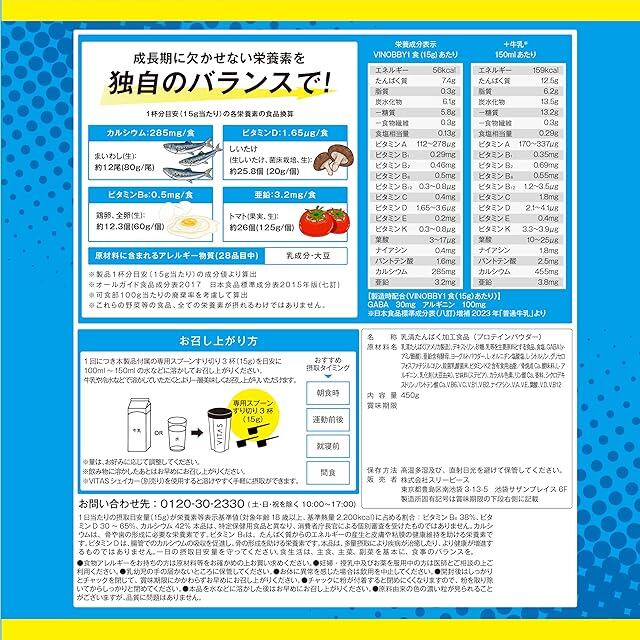 VITAS (バイタス) 成長サポート飲料 VINOBBY(バイノビー) 乳酸菌飲料風味 子供 成長 プロテイン アルギニン GABA カルシウム 亜鉛 12種のビタミン配合 国内製造 450g