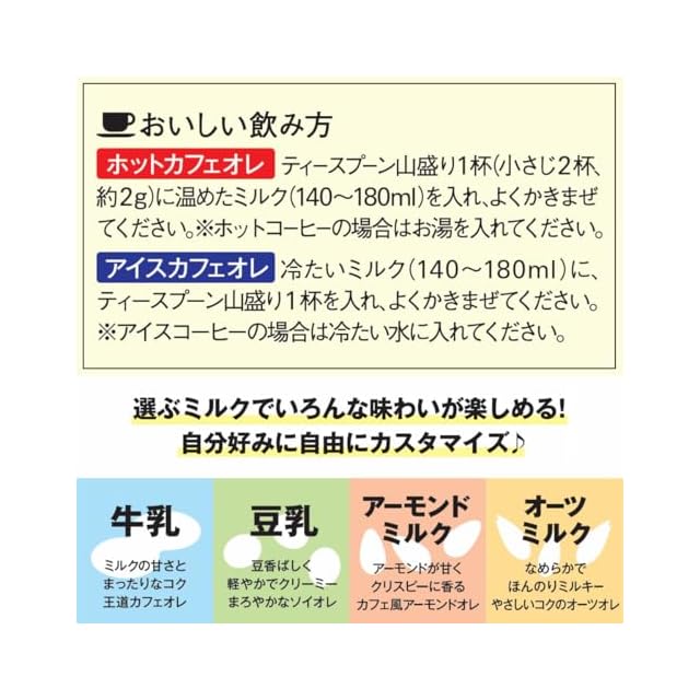 おいしい飲み方:【ホットカフェオレ】:1.耐熱カップにミルクを入れます。2.ティースプーン山盛り1杯を入れ、よくかきまぜます。3.レンジで1分20秒温めてください。※ホットコーヒーの場合はお湯を入れ、かきまぜてください【アイスカフェオレ】:1.グラスに冷たいミルクを入れます。2.ティースプーン山盛り1杯を入れ、よくかきまぜます。※アイスコーヒーの場合は冷たい水を入れ、よくかきまぜてください