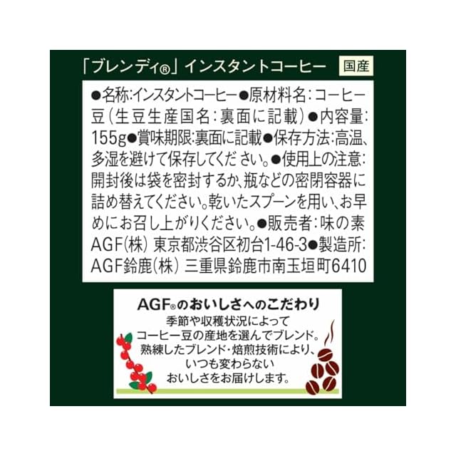 商品名:AGF ブレンディ 袋 155g 【 インスタントコーヒー 】【 水に溶けるコーヒー 】【 カフェオレ 好きに 】【 詰め替え 】