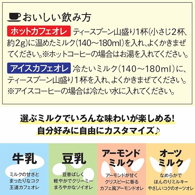 おいしい飲み方:【ホットカフェオレ】:1.耐熱カップにミルクを入れます。2.ティースプーン山盛り1杯を入れ、よくかきまぜます。3.レンジで1分20秒温めてください。※ホットコーヒーの場合はお湯を入れ、かきまぜてください【アイスカフェオレ】:1.グラスに冷たいミルクを入れます。2.ティースプーン山盛り1杯を入れ、よくかきまぜます。※アイスコーヒーの場合は冷たい水を入れ、よくかきまぜてください