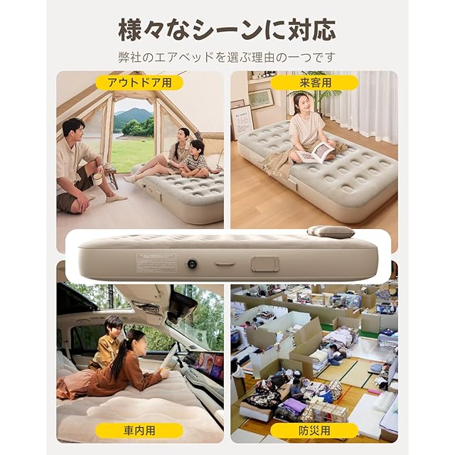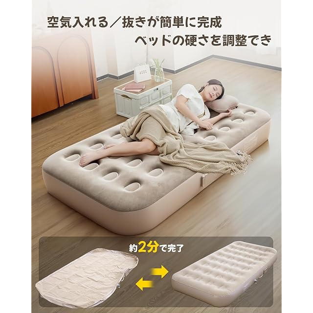 商品名:BQB エアーベッド 花見 キャンプ マット キャンプ用品 エアーマット 電動ポンプ内蔵 シングル 190×100×25cm 折り畳み式 自動膨張 ワンタッチで空気抜け Type-C充電式 取り外し可能 エアーマットレス 簡易ベッド 防水性・通気性・快適性 枕付き 収納袋付き 日本語取扱書 来客用/防災用/車中泊/引越し/家庭用/アウトドア コンパクト (ベージュ)