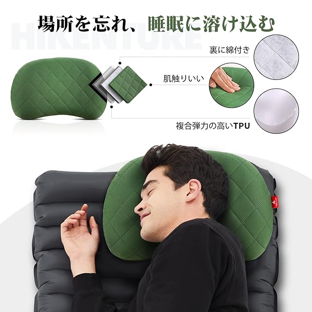 商品名:Hikenture キャンプ 枕 コンパクト【超軽量140g·コンパクト】綿カバー 洗濯可 防滑処理 エアーピロー キャンプ まくら アウトドア 枕 キャンプ用枕 エアピロー 空気枕 エアー枕 携帯枕 コットン 収納袋付き 車中泊 ツーリング グリーン 緑