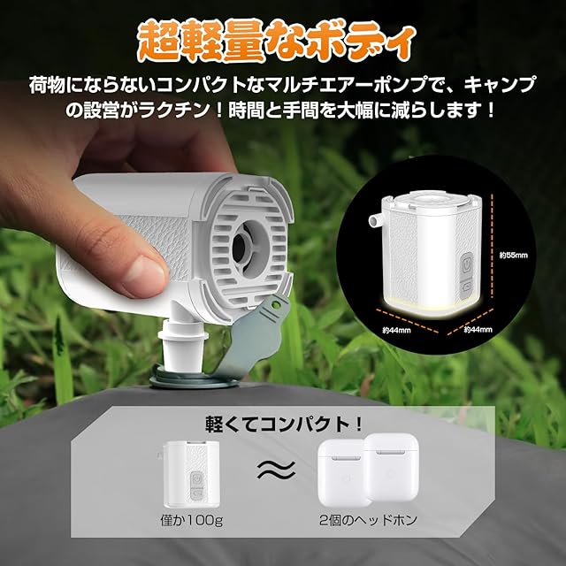 【超小型エアーポンプ】電動エアーポンプは、わずか100gの超軽量で、収納や持ち運びがとても便利です。コンパクトなサイズで、ワンボタンで簡単に操作でき、手のひらサイズのため子供でも簡単に使用できます。ビーチ、キャンプ、アウトドアなどでも大活躍します。