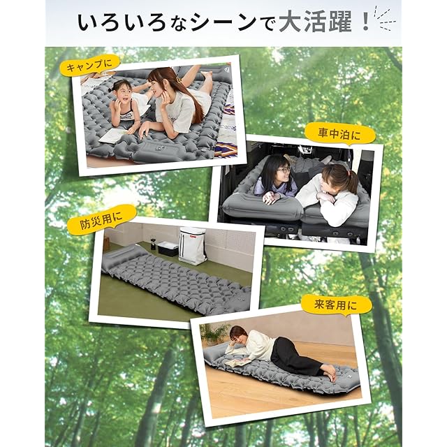 ✅【こんな人におすすめ! 】GEKETYのキャンプマットは、「簡単に膨らませられて寝心地の良いマットが欲しい」「ファミリーで連結して使いたい」「なるべく荷物を軽くしたい」という方に特におすすめです。足踏み式ポンプで準備も片付けも楽々。人間工学に基づいた枕一体型設計や無限連結可能な構造により、使い方の自由度も高く、ソロキャンプからファミリーキャンプ、さらには防災用途まで幅広く対応。防水・耐久性に優れた素材は、アウトドア初心者だけでなく、本格派のキャンパーや登山愛好家にも満足できる仕様。車中泊や緊急時用の備えとしても活躍します。
