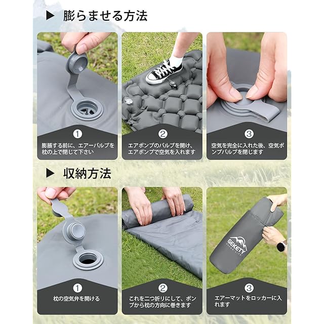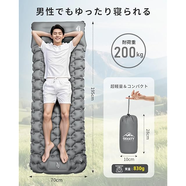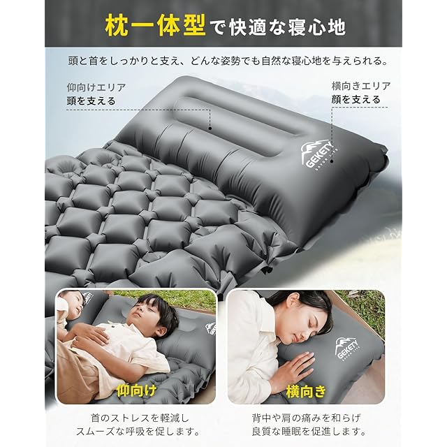 商品名:【準備・片付けが楽々!】 GEKETY エアーマット キャンプ マット 足踏み式 70×195 厚さ10cm 枕付き 無限連結可能 エアマット 車中泊 防災 来客用に コンパクトに収納 軽量800g 収納袋/補修テープ付 (グレー)