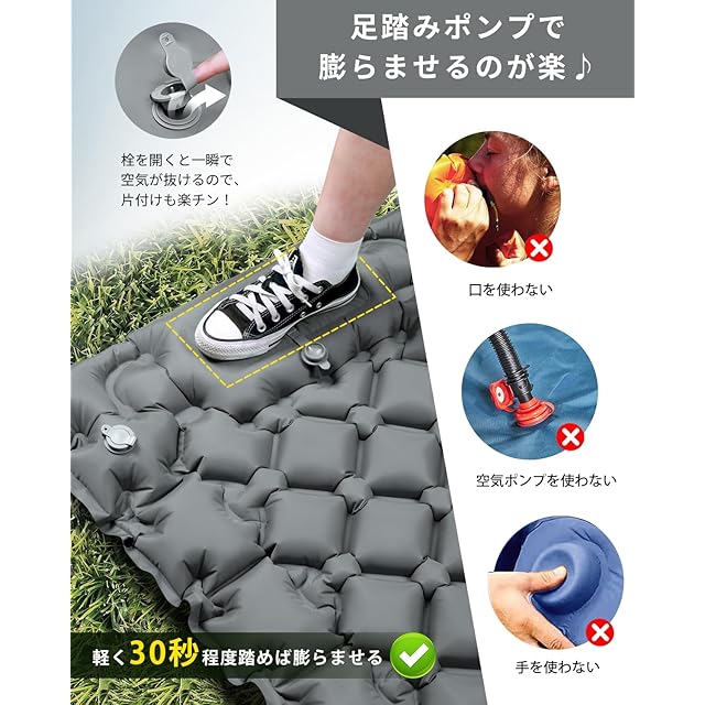✅【足踏み式ポンプで準備も片付けも楽々】GEKETYマットには足踏み式ポンプが内蔵されており、約1~2分の足踏みで膨らませることができます。空気入れや電動ポンプを別途用意する必要がなく、手軽に使えます。女性やお子様、高齢の方でも簡単にセットアップ可能なので、キャンプ初心者にもおすすめです。撤収時も短時間で空気を抜くことができ、時間と手間を大幅に省けます。気軽に使えるので、週末のお出かけや急な宿泊にも対応できます。