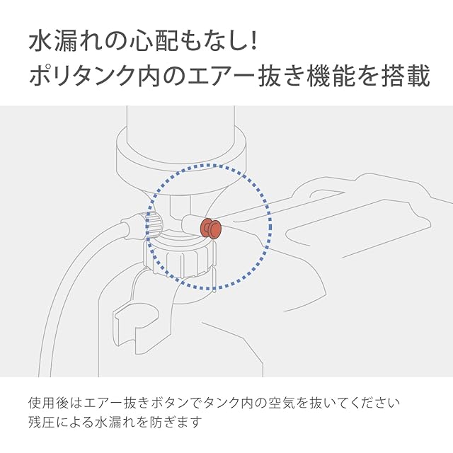水道のない場所でも使える ポリタンクに水を溜めておけば手軽にシャワーが使えアウトドアにおすすめな商品です。 電池不要の空気圧ポンプ 本体上部を20回程度ポンピングし、タンクに空気を送り込むと空気圧でシャワーがでます。 便利な止水機能 手元のレバーをスライドさせると通水・止水の切替えができます。 水漏れの心配はいりません 使用後は赤いエアー抜きボタンでタンク内の空気を抜くことで残圧による水漏れを防ぎます。