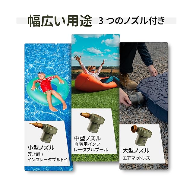 【ノズルセット付き】3つの取り外し可能なノズルを付属、ほとんどのインフレータブル製品に対応できます。エアベッド、エアソファ、インフレータブルトイ、インフレータブルプール、浮き輪などに適しています。 耐久性のあるプラスチック製で、-10℃から40℃までの温度範囲で使用可能