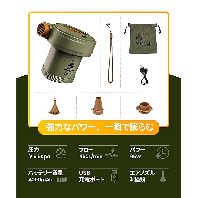 商品名:OneTigris ECOPLUSE 電動エアーポンプ キャンプ電動ポンプ Type-C充電式 450L/min 大容量4000mAh 5.5Kpa 空気入れ 空気抜き ノズルセット付き 小型 軽量 収納袋付き エアマット/浮き輪/エアーソファー/プールに対応