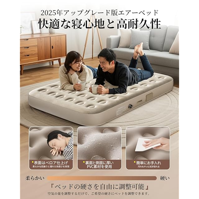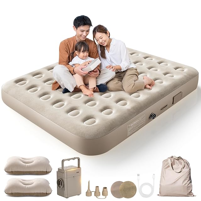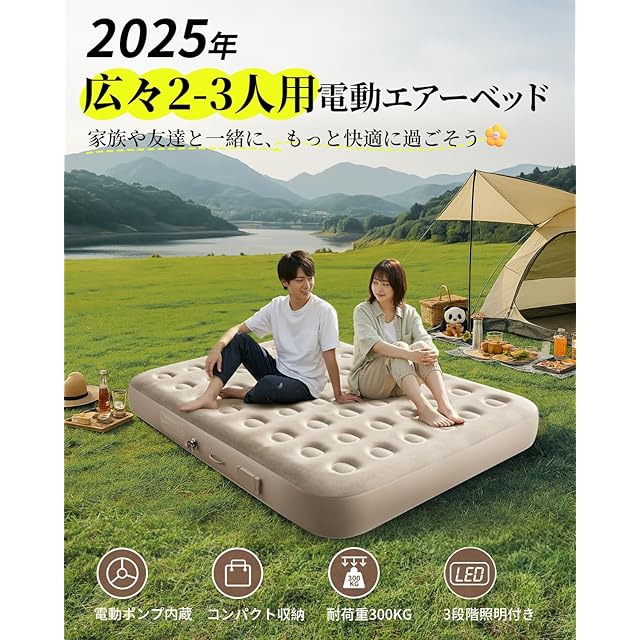 商品名:BQB エアーベッド エアーマット 電動ポンプ内蔵 取り外し可能 キャンプ用品 自動膨張/収縮 エアーマットレス 耐荷重300kg 折り畳み式 200×150×25cm 家庭用 来客用 寝袋 アウトドア 防災用 車中泊 簡易ベッド コンパクト 防水 通気性 快適性 日本語取扱説明書付き(ダブル・ベージュ)
