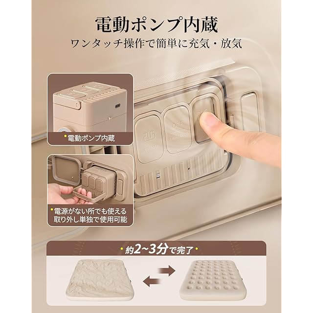 【電動ポンプ内蔵・自動膨張】 こちらは電動エアポンプを内蔵したエアーベッドで、わずか2分でワンプッシュで排気および充気ができます。お好みに合わせてエアーマットの空気量を調整することもできます。さらに、この電動ポンプは取り外して単独で使用でき、3種類のノズルが付属しており、他の用途にも適しています。内蔵されたType-C充電ポートで、充電中は赤いランプが点灯し、充電が完了すると緑のランプが点灯します。一目で分かりやすく、快適で簡単なアウトドア体験を提供します。