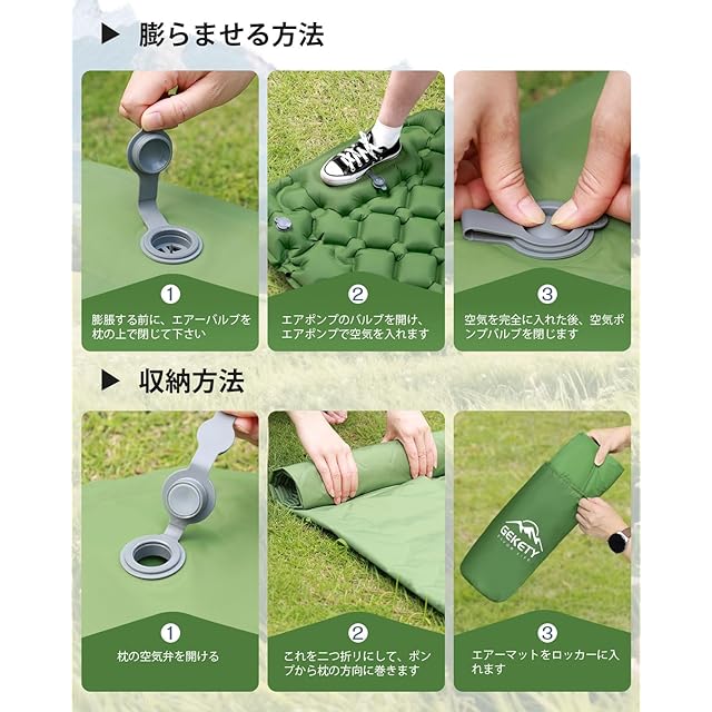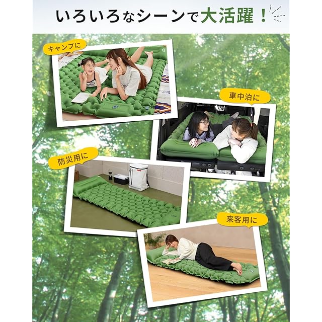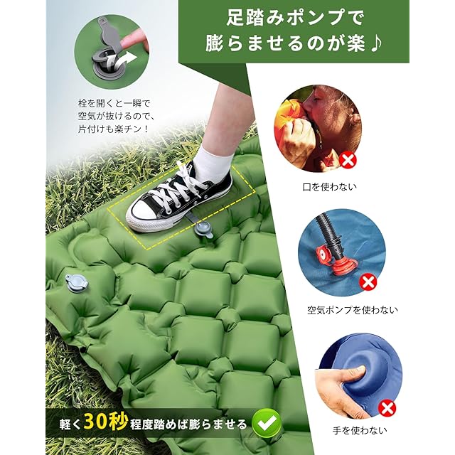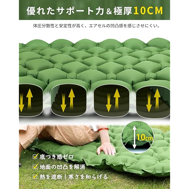 商品名:【準備・片付けが楽々!】 GEKETY エアーマット キャンプ マット 足踏み式 70×195 厚さ10cm 枕付き 無限連結可能 エアマット 車中泊 防災 来客用に コンパクトに収納 軽量800g 収納袋/補修テープ付 (グリーン)