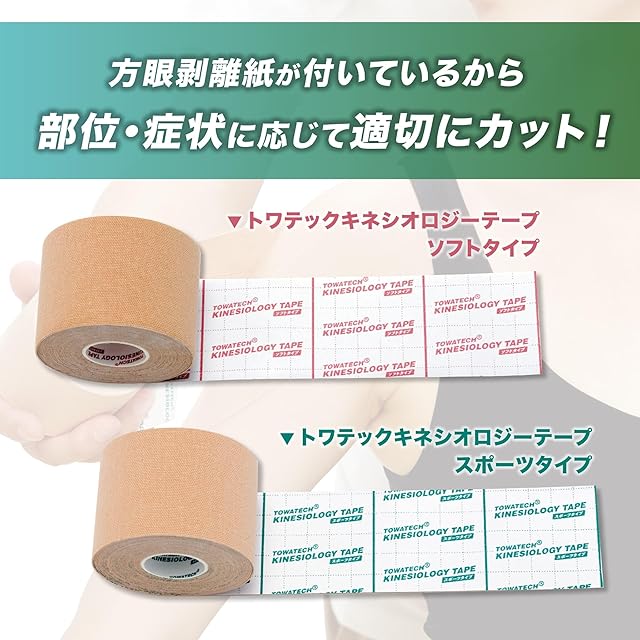 トワテックキネシオロジーテープは自社開発商品のため品質を落とさず、お求めやすいお値段でご提供しております。 より通気性に優れたソフトタイプと激しい動きでも剥がれにくいスポーツタイプをご用意していますので、肌質やシチュエーション、目的などに合わせてお選びいただけます。