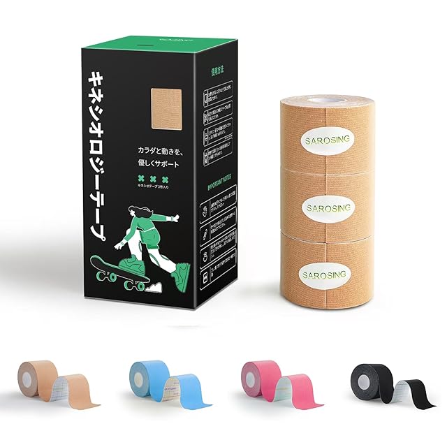 商品名:SAROSING キネシオロジーテープ 伸縮タイプ 50mm×5m|防水加工・低刺激粘着剤|スポーツ用テーピングテープ 膝・腰・手首サポート|通気性メッシュ構造で長時間快適 (肌色3ロール)