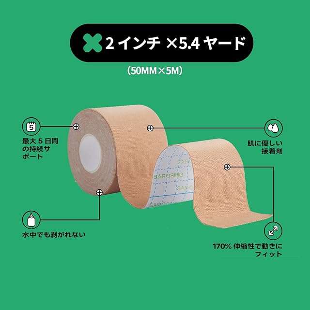 SAROSING キネシオロジーテープ 伸縮タイプ 50mm×5m|防水加工・低刺激粘着剤|スポーツ用テーピングテープ 膝・腰・手首サポート|通気性メッシュ構造で長時間快適