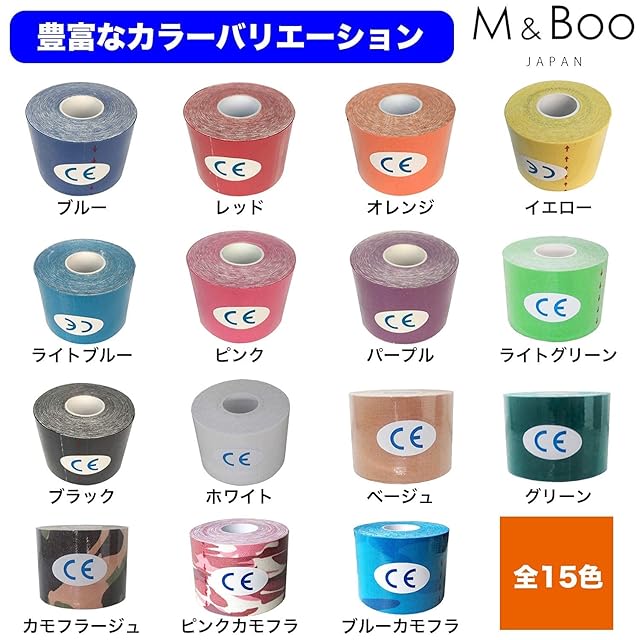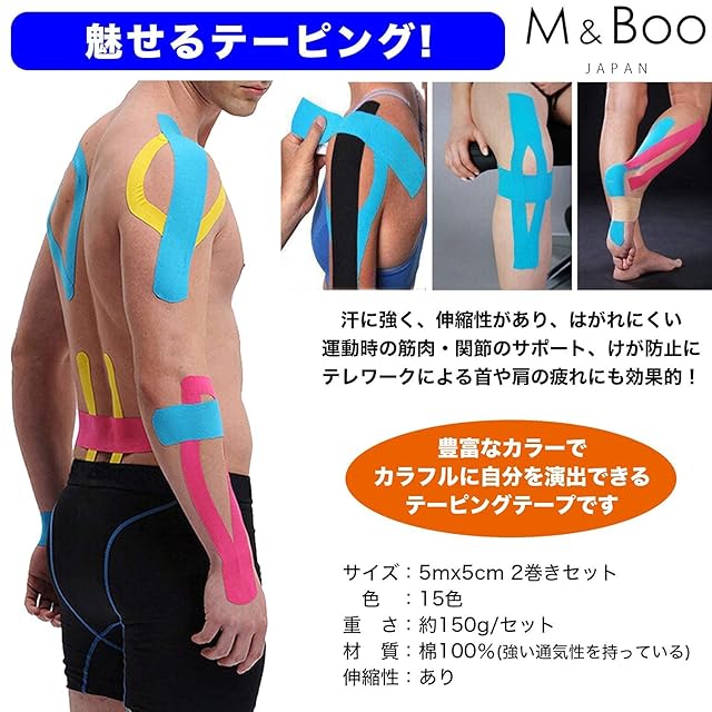 【素材】厚みがあり、しっかり固定できる綿布素材を使用していますので肌触りも良いです。患部を固定するのではなく、筋肉に沿って肌に直接貼ることでリンパ液の流れが良くなります。そのことにより、新陳代謝が良くなり、自然治癒力が高まります。貼っておくだけで、筋肉の痛みや凝り、怪我・手術後の内出血を早く改善することが出来ます。 【特定箇所の痛みに】伸縮性もほど良く、スポーツをする方やいわゆる職業病で特定の箇所をサポートしたい方におすすめです。汗や水に強く、貼ったままでシャワーや水泳も可能です。表面に小さな穴があり、通気性に富んでいます。 【疲労回復にも】リンパ液だけではなく、血液の流れも良くなります。血行が良くなると、酸素も栄養も体の隅々に行き渡る様になりますので、疲労の回復も早くなります。特にどこかが痛んだり腫れたりしていなくても、ちょっとだるいなという時、疲れがなかなか取れないなという時、また、冷え性でお悩みの方にも効果的です。 【魅せるカラーテーピング】隠すのではなく"魅せるテーピング"としてカラーを豊富に取り揃えました。 【おすすめ使用サイズ】- 2.5cm/指・手・首・肘・ふくらはぎ・肩など。5.0cm/ふくらはぎ・膝・手首・腰・太ももなど。