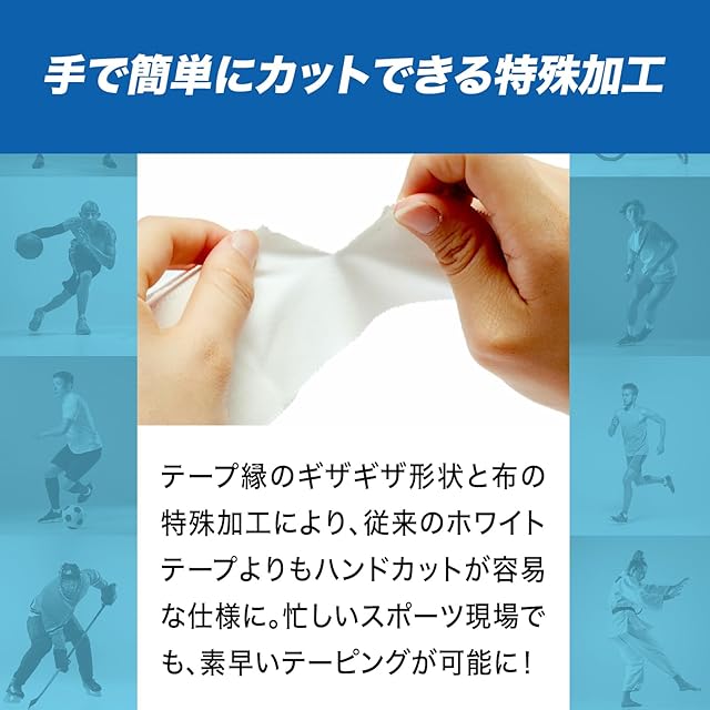 激しい動きに負けない固定力と耐久性を兼ね備えた非伸縮性テープです。引っ張り断裂に対する高い強度と優れたサポート力をもちハンドカットしやすく、リーズナブルなのでハードユースにも最適です。