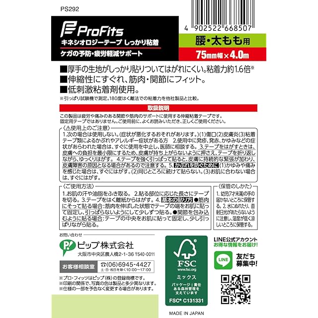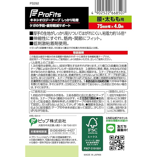 商品名:ピップスポーツ ピップ プロ・フィッツ キネシオロジーテープ しっかり粘着 テーピング 腰・ひざ・太もも用 75mm×4.0m ベージュ スポーツ