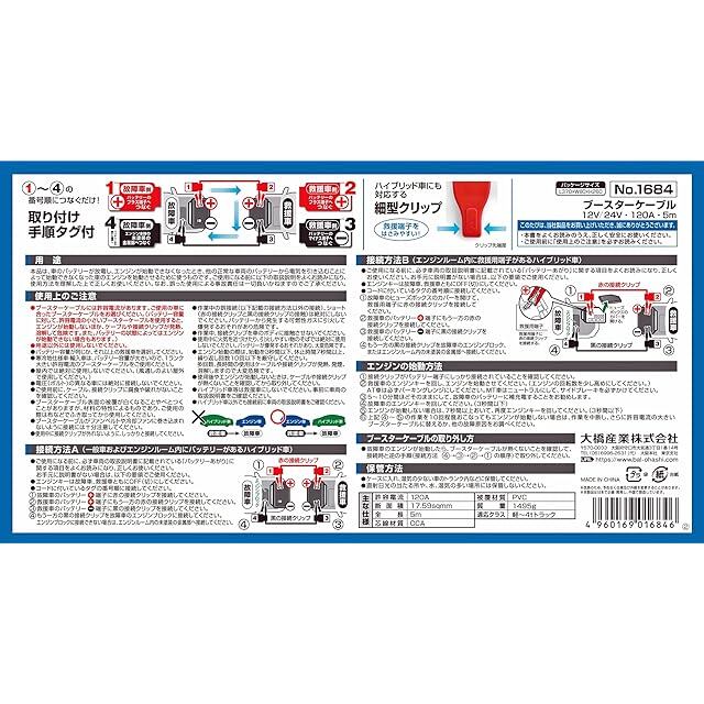 商品名:BAL(大橋産業) ブースターケーブル DC12V DC24V 120A 5m 軽自動車 普通乗用車 SUV トラクター 2t 4tトラック HV ハイブリット車 救援端子 細型絶縁フルカバークリップ 取り付け手順タグ 品番:1684