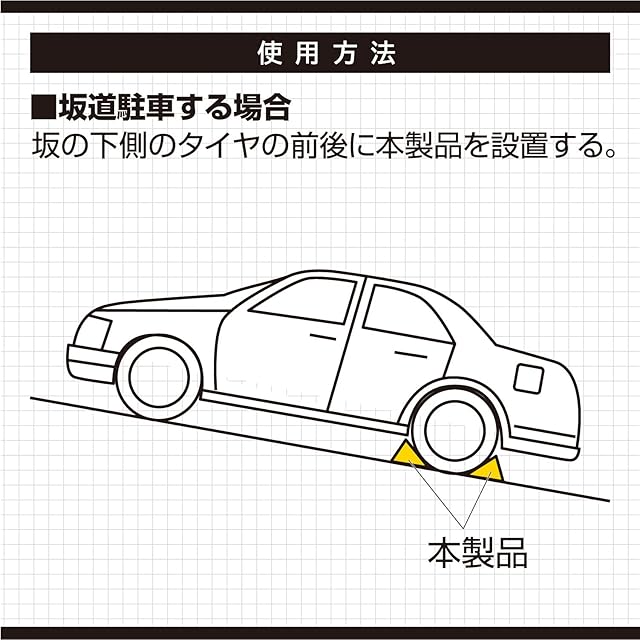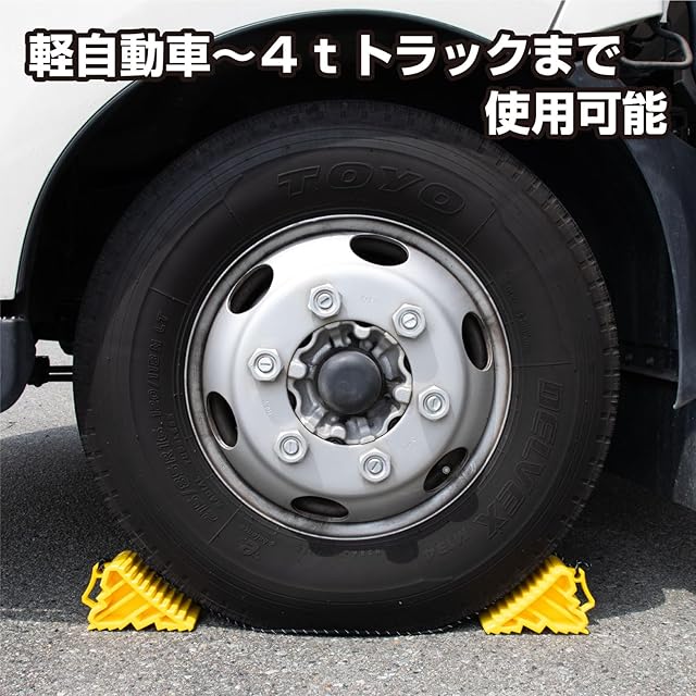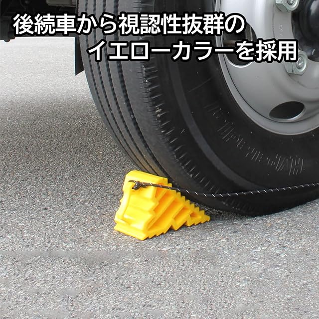 坂道駐車、ジャッキアップ時の輪止め。軽くて強い樹脂製タイヤストッパー。後続車から視認性抜群のイエローカラーを採用。夜間も目立つ反射ロープ付属。