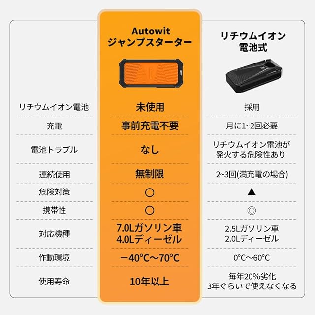 【高安全性・長寿命の設計】従来のジャンプスターターと異なり、Autowitジャンプスターターはバッテリーレスの設計になっているため、事前充電による発熱、破裂、爆発などの心配はありませんので、安全で使用できます。商品本体には蓄電しないので、性能が劣化することが少なく、長い時間ご使用頂けます。