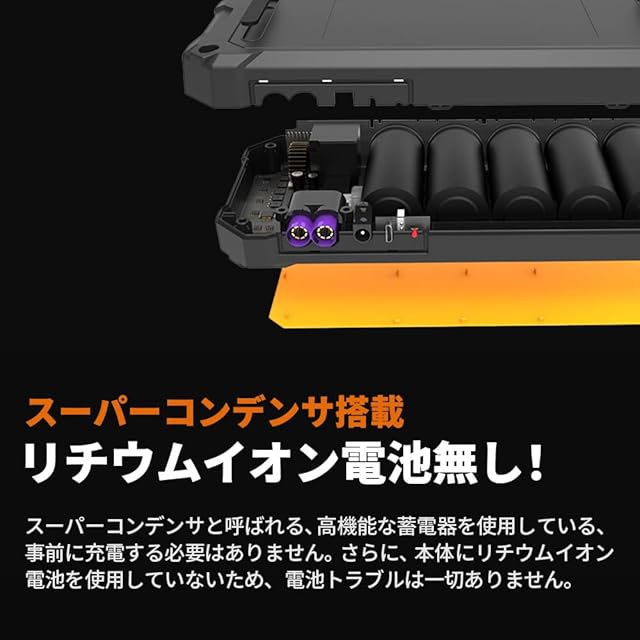 【スーパーコンデンサ内蔵】Autowitジャンプスターターにはリチウムイオン電池でなく、スーパーコンデンサを搭載したので、事前充電することが要らなく、車に残された僅かな電力をすぐに集電することで、2から3分間に電力を増幅し、車を起動させることができます。