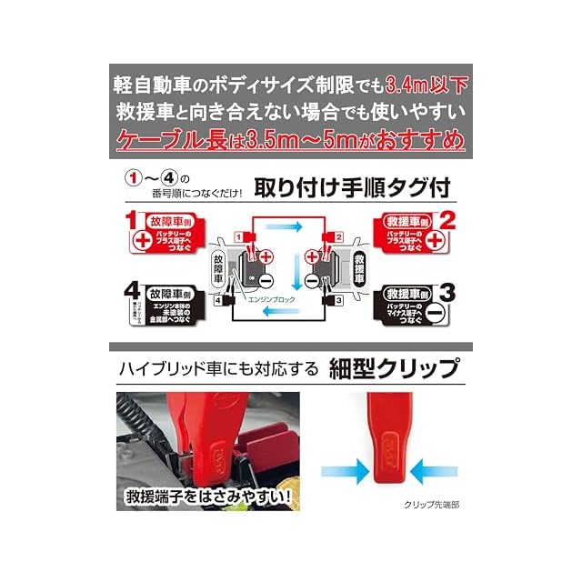 商品名:BAL(大橋産業) ブースターケーブル DC12V DC24V 100A 5m 軽自動車 コンパクトカー 普通乗用車 SUV ワンボックス トラクター 2tトラック HV ハイブリット車 救援端子 細型絶縁フルカバークリップ 取り付け手順タグ 品番:1683