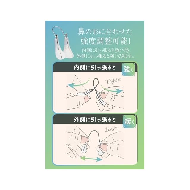【ご自分の形に合わせれるデザイン】内外を引っ張る事で強度を自在に変更できるので、ご自分の鼻の形に合わせた調整が可能です。 ※強く引っ張ると金具が変形、折れにつながりますので優しくお願いいたします。鼻の脂をきちっとふき取ってから使用してください。