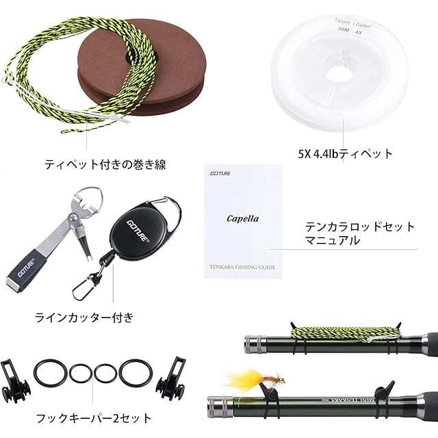 【セット内容】:3.6mテンカラロッド(12ft) 、2枚ピース(予備) 、3.6mテンカラライン(12ft) 、 5X 50Mティペット 、毛バリ8本セット 、ロッド専用ケース 、ラインカッター 、ハードケース 、フックキーパー 、テンカラ用仕掛け巻き 、取扱説明書