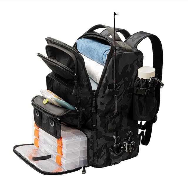 【多機能で広々とした収納】この釣り用タックルバックパックは、アウトドア愛好者に最適な収納ソリューションを提供します。複数のコンパートメント、ポケット、調整可能な仕切りがあり、釣り道具やギア、アクセサリーを効率的に整理できます。最大40Lの容量を持ち、4つの大型タックルボックスを収納可能なため、内部スペースを自由にカスタマイズでき、釣りの際に必要なものがすぐ手に届きます。