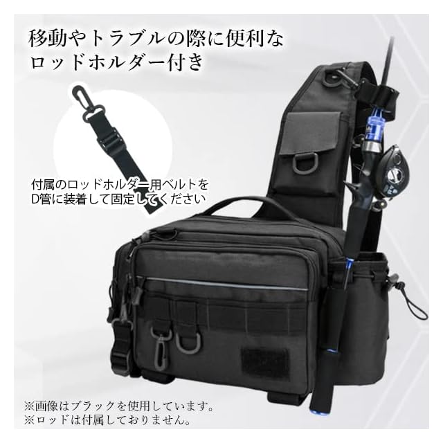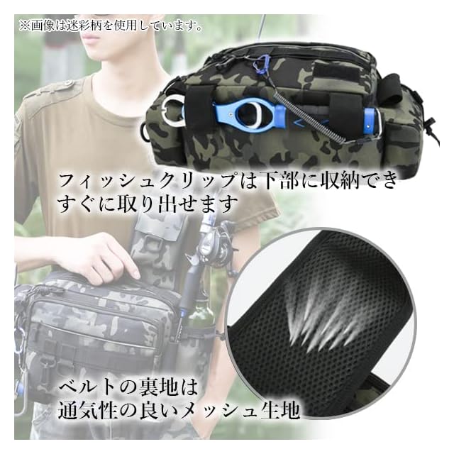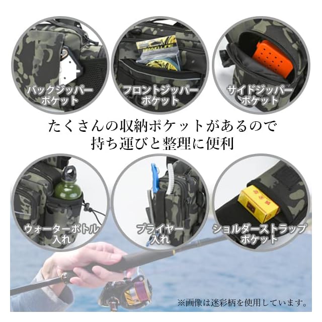 ・収納力抜群。さらにコンパクト。 ・たくさんの収納ポケットがあるので持ち運びと整理に便利です。 ・移動やトラブルの際に便利なロッドホルダー付き。 ・ベルトの裏地は通気性の良いメッシュ生地。 ・フィッシングバッグだけど普段使いや女性にもオススメ。 【商品仕様】 カラー 迷彩ネイビー