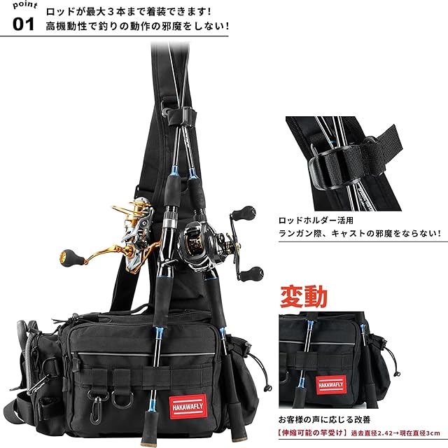 商品名:HAKAWAFLY フィッシングバッグ5WAY ロッドベルト2点とカラビナ5点付き 釣りバッグ 防水 タックルバッグ 多機能 大容量 ランガンバッグ (ブラック)