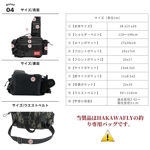 【重さ】620g【全体サイズ】幅38cm x 縦13cm x 高さ20cm 【メインポケット】27x20x10cm【フロントポケット×2】25x17x4cmと25x17cm【サイドポケット】15x8.5x5cm【肩サイドポケット】11x8.5x2cm【背面ポケット】22x19cm【背面隠しポケット】14x19cm【カップポケット】直径8cm 【大容量】:メインポケットには中型ボックス(24x12cm程度)が2、3個程度収納可能ポケットが多く設計タックルバッグ。背中に隠しファスナーポケットがあり、貴重品など入れることができます。ペットボトル、ペンチ、プライヤー、フィッシュグリップを収納する嬉しい専用ポケット。フィッシング専用バッグは多数のポケットを装備しみんなさんの快適な釣りをサポート。ショルダーベルトは110~140cmまで延長でき、ウエストベルトは56~110cmまで調節できます釣りカバン。