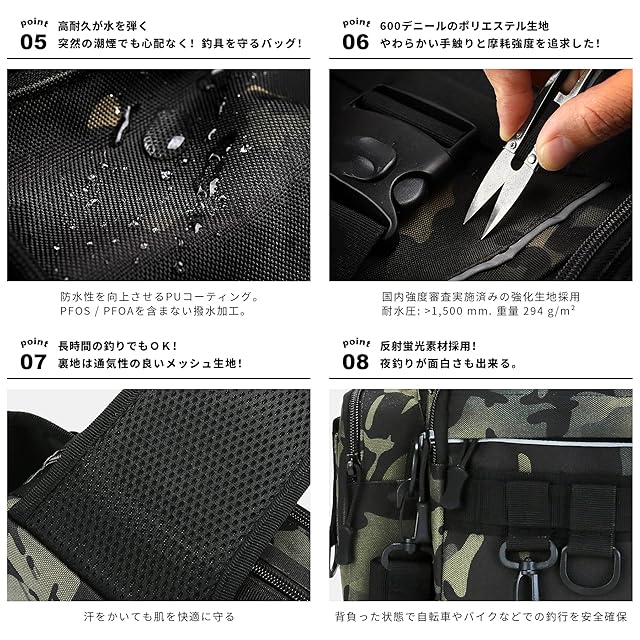 【高品質材料防撥水】「釣り専用」に基づいて、作り上げたフィッシングバッグ。釣り用に購入するには最適。「いつでもこれ一個で釣行」そんな職人の想いを込めて丁寧に作られていますタックルバッグ。600D オックスフォードポリエステル, ブルーサイン認証。やわらかい手触りと摩耗強度を追求した600デニールの平織りポリエステル生地を縫製した製品。防水性を向上させるPUコーティング。 PFOS / PFOAを含まない撥水加工。耐水圧: >1800 mm. 重量 294 g/m² ※写真を撮った時の光線やお使いのPCモニター環境により、画像のカラーは実物と若干色収差があるかもしれません。