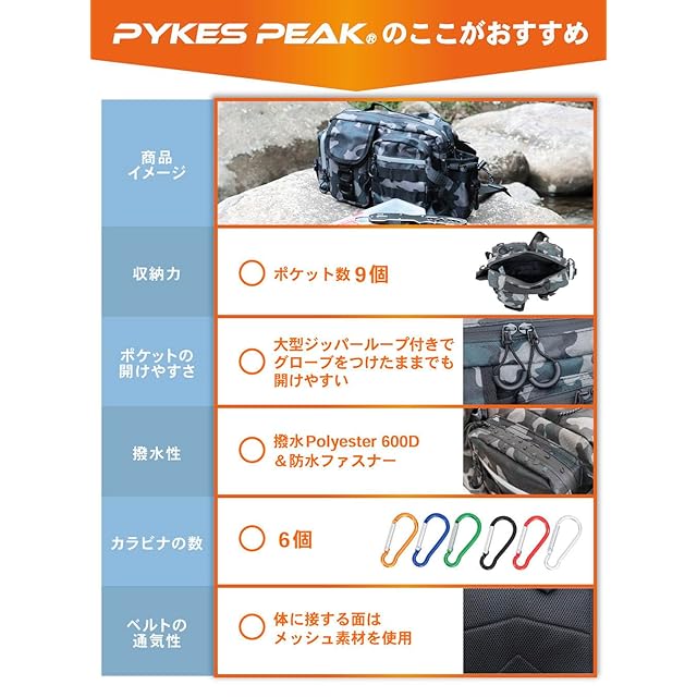 【仕様 / セット内容 / メーカー】 【仕様】本体サイズ:280mm × H200mm × D90mm ウエストベルト長さ : 530~1000㎜ ショルダーベルト長さ : 870~1130㎜ 【材質】表地 : ポリエステル 裏地 : ポリエステル 【セット内容】本体×1、カラーカラビナ×6 【カスタマーサービス】PYKES PEAKは日本のメーカーです。カスタマー対応も日本人スタッフが日本語で丁寧に対応いたします。