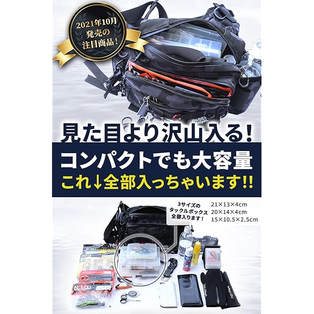 【用途】釣り専用のフィッシングバッグ、ワンショルダーバッグ、ショルダーバッグ、ウエストバッグ、タックルバッグとして。小さめでも大容量なのでおかっぱり、サーフフィッシィング、渓流釣り等のランガンスタイルにも最適です。ベルト調節も可能なのでメンズ、レディース、男女問わずお使い頂けます。