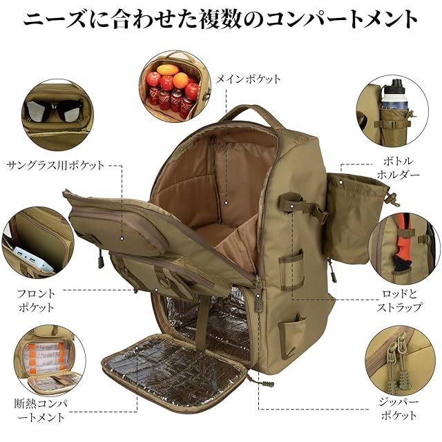 【革新的で戦術的なデザイン】内蔵ロッドホルダー、断熱クーラーバッグ、タクティカルモールシステムなど、釣り愛好者の多様なニーズに応える革新的な機能が満載です。独自の構造にはポリプロピレン製の支持ボードが使われており、バッグが自立することで、釣り道具やアクセサリーに迅速にアクセスできます。