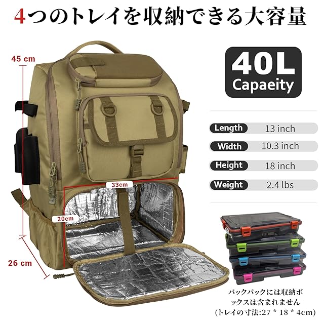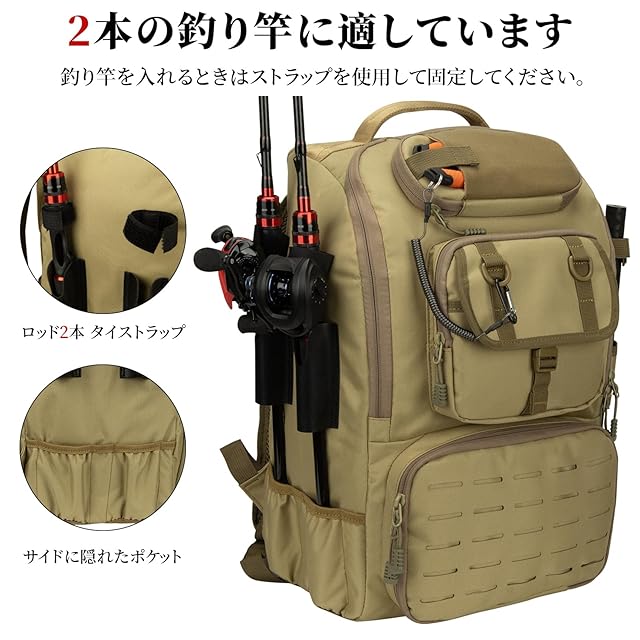 【多機能で広々とした収納】この釣り用タックルバックパックは、アウトドア愛好者に最適な収納ソリューションを提供します。複数のコンパートメント、ポケット、調整可能な仕切りがあり、釣り道具やギア、アクセサリーを効率的に整理できます。最大40Lの容量を持ち、4つの大型タックルボックスを収納可能なため、内部スペースを自由にカスタマイズでき、釣りの際に必要なものがすぐ手に届きます。